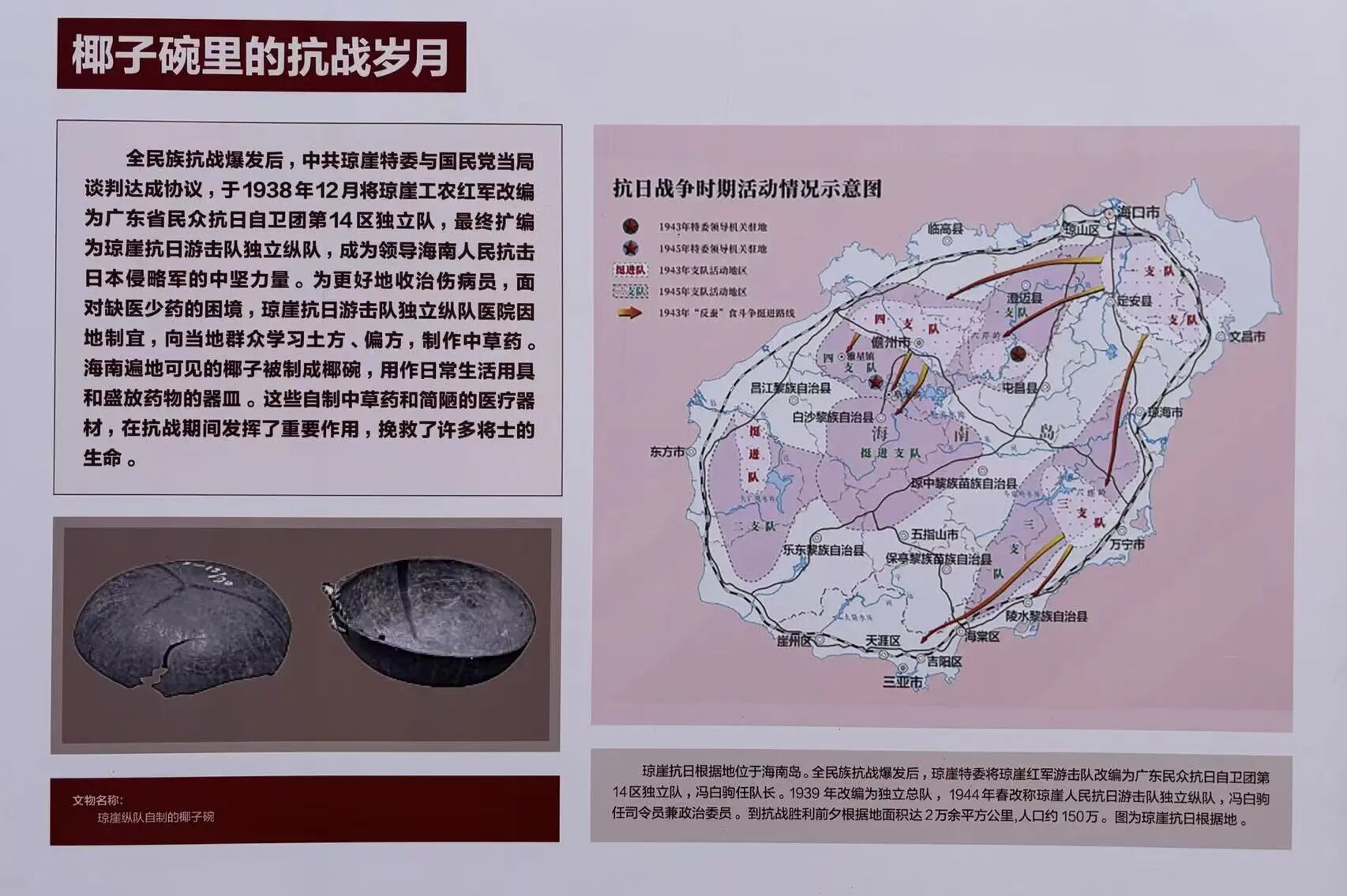 在海南岛茂密的椰林中,琼崖抗日游击队曾用一个个简陋的椰子碗,盛放过救命的汤药,也分装过传递军情的密信。展板中央的椰子碗,表面还留存着当年战士们手工打磨的痕迹。